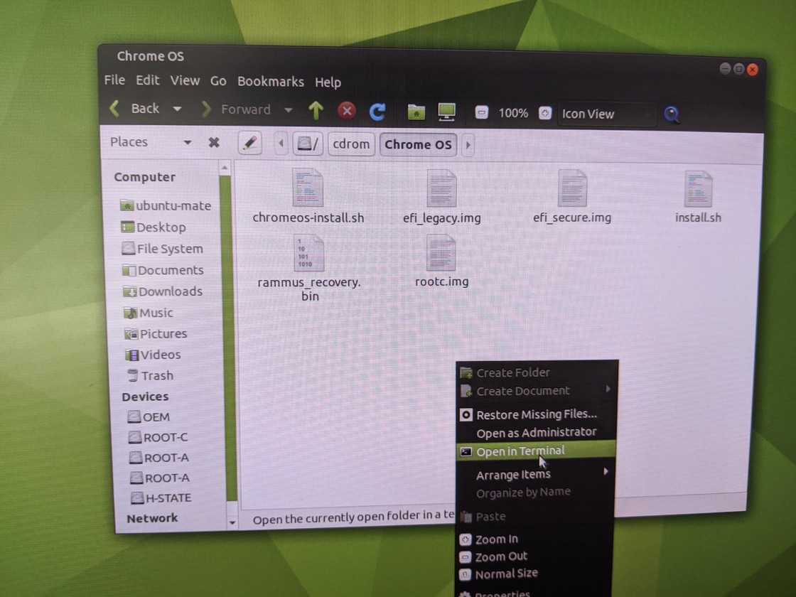 然后雙擊打開(kāi)桌面上的文件管理器,點(diǎn)擊左側的File system,然后導航至/cdrom/Chrome OS,在當前目錄下,右鍵點(diǎn)擊選擇Open in Terminal。