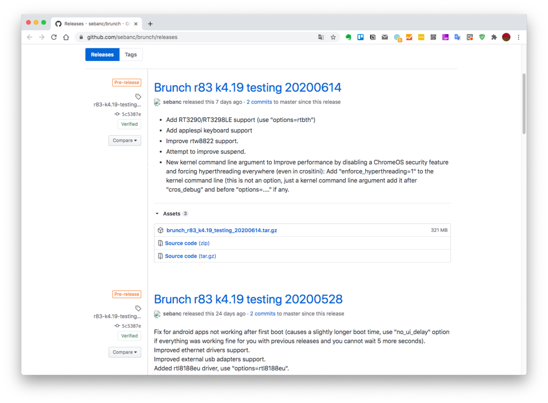 緊接著(zhù)我們需要下載 Chrome 安裝框架,開(kāi)發(fā)人員 sebanc 開(kāi)發(fā)的 Brunch 構建框架,這里我們直接在其 GitHub 中下載,因為我們安裝的是最新版的 Chrome OS,因此選擇最新預發(fā)行版本「Brunch r83 k4.19 testing 20200614」進(jìn)行下載。