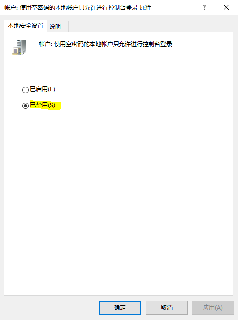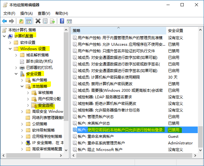 然后,在打開(kāi)的組策略窗口中,依次選擇 計算機配置→Windows 設置→安全設置→本地策略→安全選項,然后在右邊窗口中找到 賬戶(hù):使用空密碼的本地賬戶(hù)只允許進(jìn)行控制臺登陸 選項,雙擊打開(kāi)。