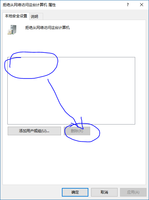 將 拒絕從網(wǎng)絡(luò )訪(fǎng)問(wèn)這臺計算機 里面的所有用戶(hù)選中,點(diǎn)擊刪除,然后點(diǎn)擊確定,即可。