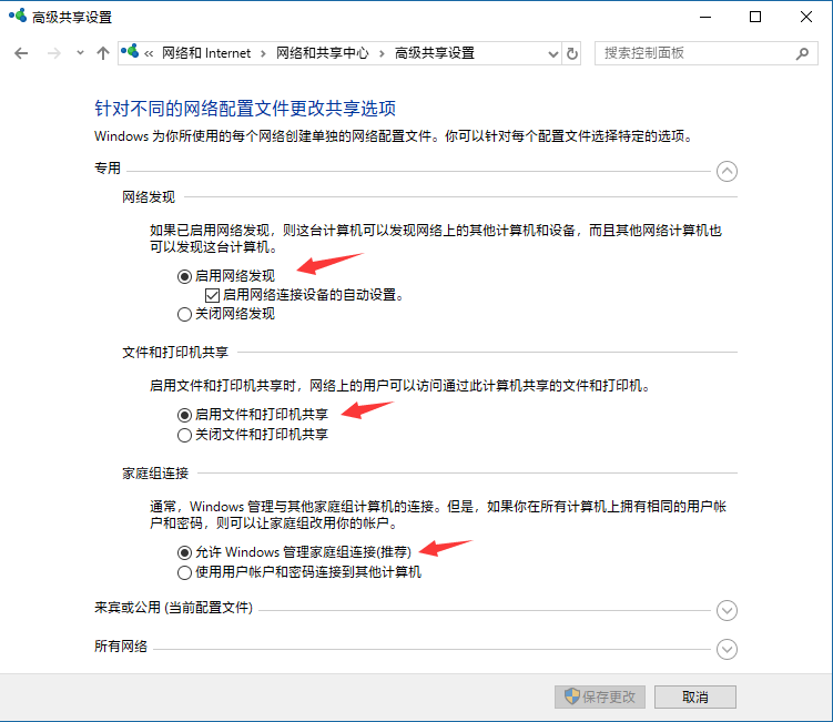通過(guò) Cortana 輸入高級共享設置,打開(kāi)高級共享設置 對話(huà)框,按照下面選擇即可: