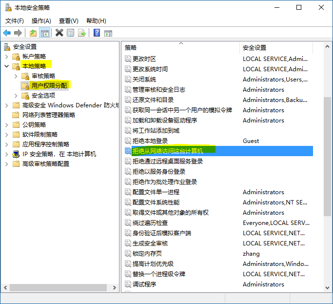 然后,在打開(kāi)的本地安全策略左邊窗口,依次選擇 安全設置→本地策略→用戶(hù)權限分配,然后在右邊窗口找到 拒絕從網(wǎng)絡(luò )訪(fǎng)問(wèn)這臺電腦,雙擊打開(kāi)。