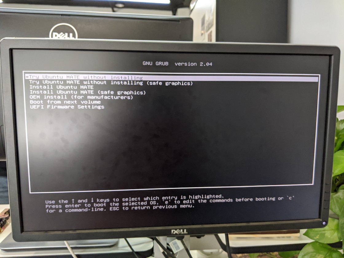 設備重啟后,在 GNU GRUB 中選擇第一項目(Try Ubuntu MATE without installing)然后回車(chē)進(jìn)入 Ubuntu MATE Live USB 中。