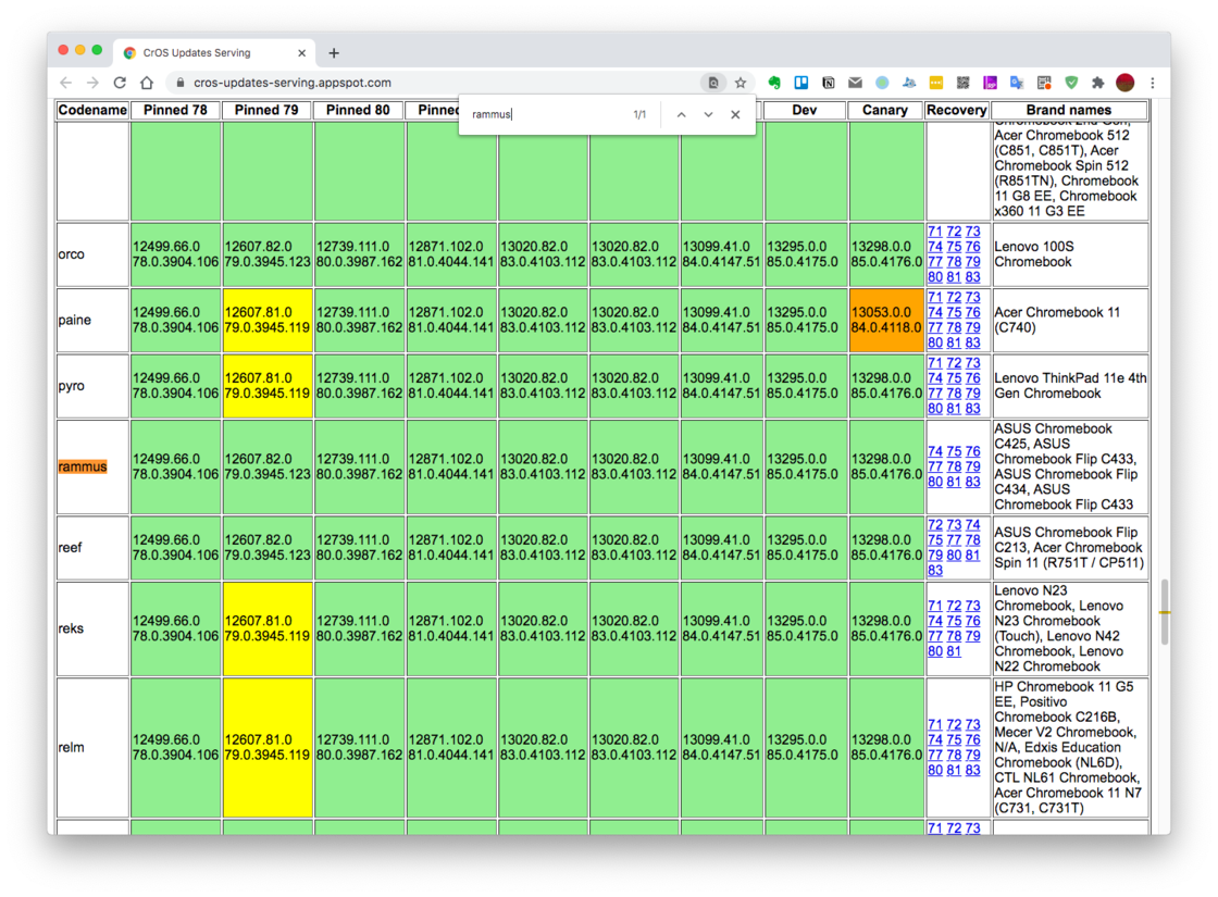 下面我們準備 Google 官方的 Chrome OS 恢復鏡像,打開(kāi)這個(gè) 離線(xiàn)鏡像搜集網(wǎng)站,然后使用快捷鍵 CTRL + F 搜索關(guān)鍵字「rammus」,然后在對應的表格行的「Recovery」中點(diǎn)擊「83」下載恢復鏡像。